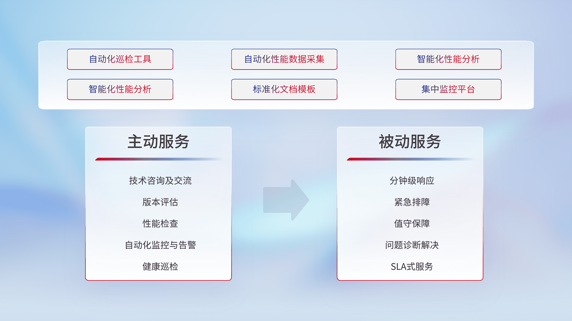 智能化工具和标准化文档,,保障服务质量,,提供主动服务(包含技术咨询、、、、版本评估、、、、性能检查、、、、自动化监控与告警、、、健康巡检)和被动服务包含(分钟级响应、、、紧急排障、、值守保障、、问题诊断解决、、SLA服务)。。。。
